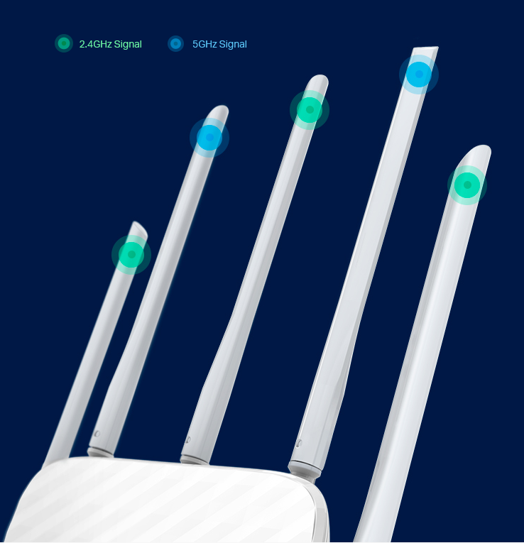 Archer C60’s innovative design includes five antennas, three at 2.4GHz and two at 5GHz.  These have been arranged alternately to optimize the dual band 802.11ac Wi-Fi, creating a transmission with maximized coverage, minimized interference.